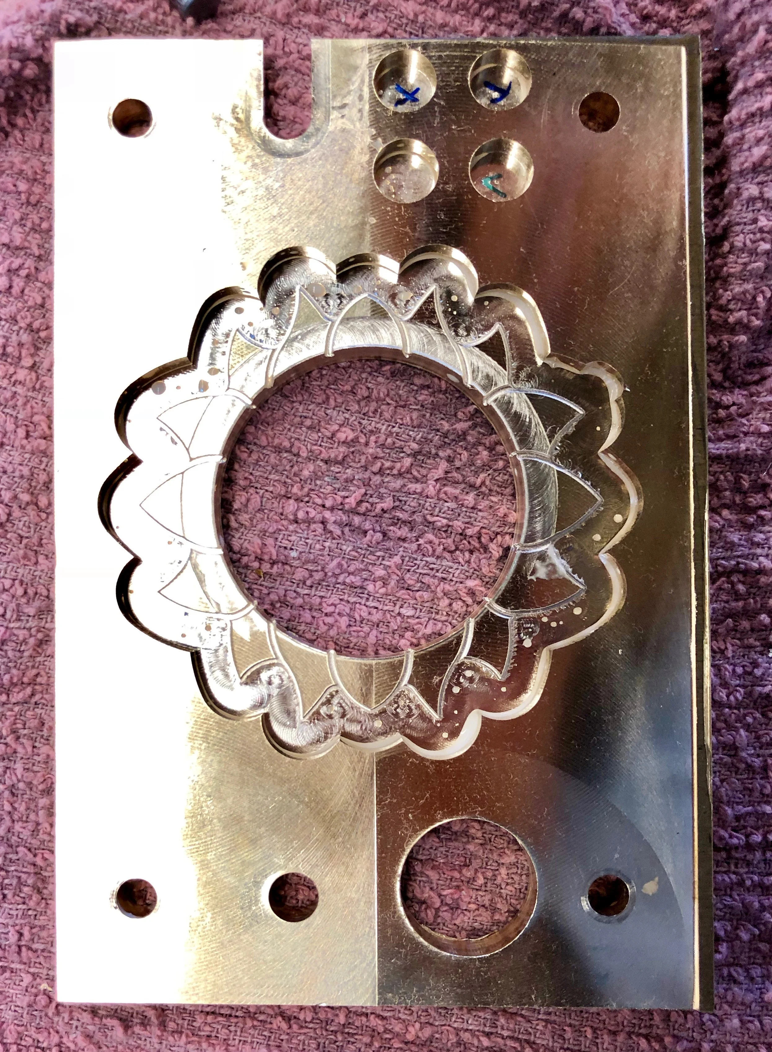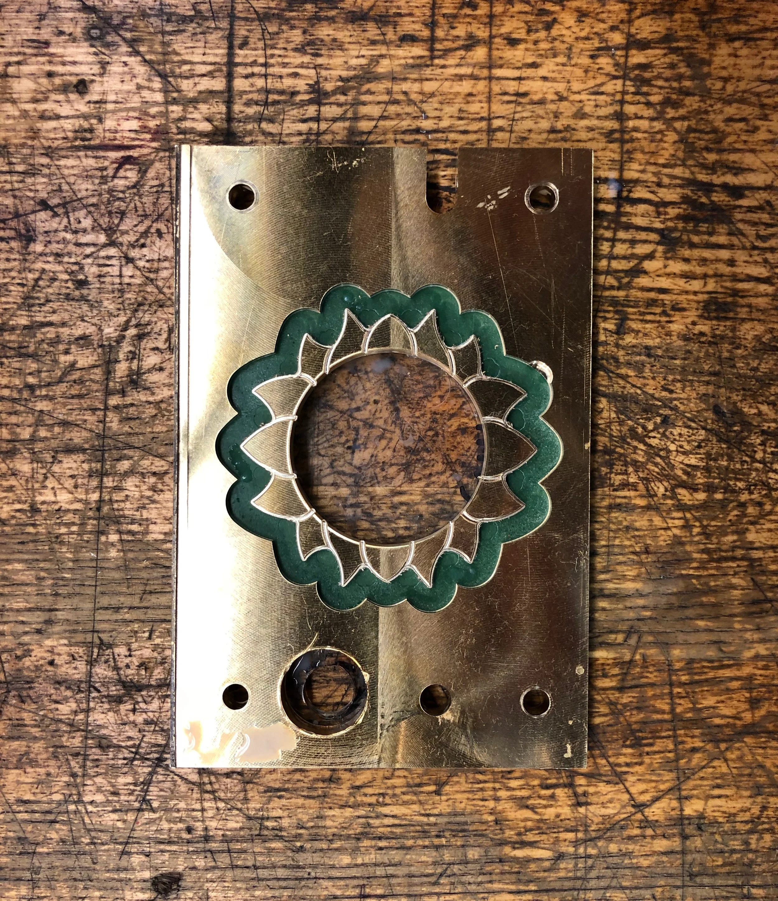 The milled brass before pouring fixturing wax. Tests for pill hole sizing are visible at the top of the piece.