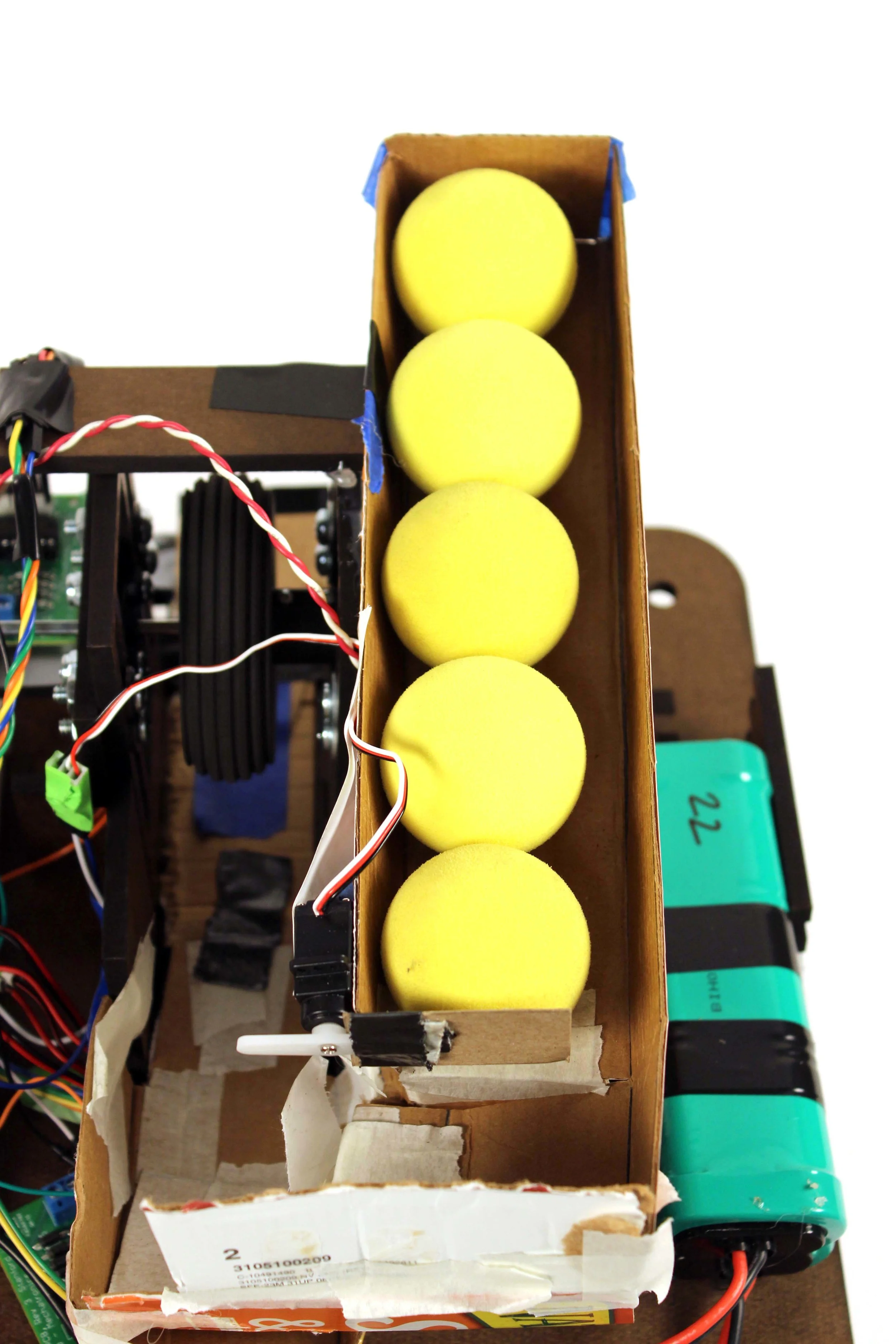 In 2 mins 10s, autonomously navigate the game board to a loading location, load ammunition (yellow nerf balls), locate your opponent’s towers, and shoot them down. The team with the most towers knocked down wins.